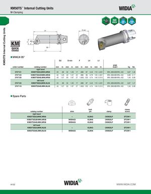 KM50TS Internal Cutting Units KM50TS™ Internal Cutting Units M-Clamping MWLN 95° D2 D min F L4 L1 gage order number catalog number mm in mm in mm in mm in mm in insert kg lbs right hand 3747121 KM50TSS25JMWLNR08 25 .98 32 1.26 17 .669 87 3.43 110 4.331 WN..080408/WN..432 0,67 1.48 3747123 KM50TSS32KMWLNR08 32 1.26 40 1.57 22 .866 96 3.79 125 4.921 WN..080408/WN..432 0,99 2.17 3747120 KM50TSS40LMWLNR08 40 1.57 50 1.97 27 1.063 120 4.74 140 5.512 WN..080408/WN..432 1,40 3.08 left hand 3747122 KM50TSS25JMWLNL08 25 .98 32 1.26 17 .669 87 3.43 110 4.331 WN..080408/WN..432 0,67 1.47 3747119 KM50TSS40LMWLNL08 40 1.57 50 1.97 27 1.063 120 4.74 140 5.512 WN..080408/WN..432 1,40 3.08 Spare Parts lock clamp catalog number shim pin clamp screw right hand KM50TSS25JMWLNR08 — KLM43 CKM20LP STCM11 KM50TSS32KMWLNR08 IWSN433 KLM46 CKM20LP STCM11 KM50TSS40LMWLNR08 IWSN433 KLM46 CKM20LP STCM11 left hand KM50TSS25JMWLNL08 — KLM43 CKM20LP STCM11 KM50TSS40LMWLNL08 IWSN433 KLM46 CKM20LP STCM11 A152 WWW.WIDIA.COM