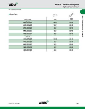 KM50TS Internal Cutting Units KM50TS™ Internal Cutting Units TopThread™ and TopGroove™ (NE 90° • Steel continued) Spare Parts clamp catalog number clamp screw right hand KM50TSS12ENER2 CM147 MS1488 KM50TSS16FNER2 CM147 MS1488 KM50TSS20HNER2 CM75 MS1488 KM50TSS25JNER3 CM73 MS1489 KM50TSS32GNER3 CM73 MS1489 KM50TSS32KNER3 CM73 MS1489 KM50TSS40JNER4 CM73 MS1489 KM50TSS40LNER3 CM73 MS1489 KM50TSS40LNER4 CM73 MS1489 left hand KM50TSS12ENEL2 CM146 MS1488 KM50TSS16FNEL2 CM146 MS1488 KM50TSS20HNEL2 CM74 MS1488 KM50TSS25JNEL3 CM72 MS1489 KM50TSS32GNEL3 CM72 MS1489 KM50TSS32KNEL3 CM72 MS1489 KM50TSS40JNEL4 CM72 MS1489 KM50TSS40LNEL3 CM72 MS1489 KM50TSS40LNEL4 CM72 MS1489 WWW.WIDIA.COM A157