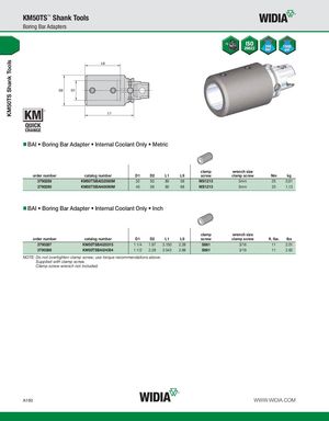KM50TS Shank Tools KM50TS™ Shank Tools Boring Bar Adapters BAI • Boring Bar Adapter • Internal Coolant Only • Metric clamp wrench size order number catalog number D1 D2 L1 L9 screw clamp screw Nm kg 3790289 KM50TSBAI32080M 32 50 80 58 MS1213 5mm 25 0,91 3790290 KM50TSBAI40090M 40 58 90 68 MS1213 5mm 25 1,13 BAI • Boring Bar Adapter • Internal Coolant Only • Inch clamp wrench size order number catalog number D1 D2 L1 L9 screw clamp screw ft. lbs. lbs 3790287 KM50TSBAI20315 1 1/4 1.97 3.150 2.28 S861 3/16 11 2.01 3790288 KM50TSBAI24354 1 1/2 2.28 3.543 2.68 S861 3/16 11 2.62 NOTE: Do not overtighten clamp screw; use torque recommendations above. Supplied with clamp screw. Clamp screw wrench not included. A160 WWW.WIDIA.COM