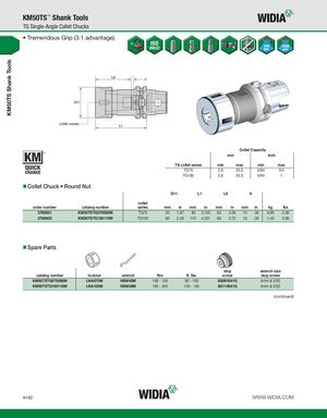 KM50TS Shank Tools KM50TS™ Shank Tools TG Single-Angle Collet Chucks • Tremendous Grip (3:1 advantage). collet series Collet Capacity mm inch TG collet series min max min max TG75 2,6 20,0 3/64 3/4 TG100 2,6 25,5 5/64 1 Collet Chuck • Round Nut D11 L1 L9 V collet order number catalog number series mm in mm in mm in mm in kg lbs 3790601 KM50TSTG075080M TG75 50 1.97 80 3.150 53 2.09 10 .39 0,95 2.09 3790602 KM50TSTG100110M TG100 60 2.36 110 4.331 69 2.72 10 .39 1,40 3.09 Spare Parts stop wrench size catalog number locknut wrench Nm ft. lbs. screw stop screw KM50TSTG075080M LNA075M HSW45M 108 - 136 80 - 100 SS081041G 4mm & 5/32 KM50TSTG100110M LNA100M HSW58M 163 - 203 120 - 150 SS112041G 4mm & 5/32 (continued) A162 WWW.WIDIA.COM