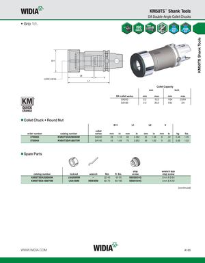 KM50TS Shank Tools KM50TS™ Shank Tools DA Double-Angle Collet Chucks • Grip 1:1. collet series Collet Capacity mm inch DA collet series min max min max DA200 0.2 10,0 1/64 25/64 DA180 2.2 20,0 1/64 3/4 Collet Chuck • Round Nut D11 L1 L9 V collet order number catalog number series mm in mm in mm in mm in kg lbs 3789365 KM50TSDA208060M DA200 28 1.10 60 2.362 35 1.38 8 .32 0,48 1.05 3789364 KM50TSDA188075M DA180 43 1.69 75 2.953 49 1.93 5 .20 0,69 1.52 Spare Parts stop wrench size catalog number locknut wrench Nm ft. lbs. screw stop screw KM50TSDA208060M LNA208RM — 32-40 45-55 SS038031G 2mm & 5/64 KM50TSDA188075M LNA188M HSW45M 60-75 80-100 SS081041G 4mm & 5/32 (continued) WWW.WIDIA.COM A165