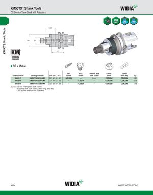 KM50TS Shank Tools KM50TS™ Shank Tools CS Combi-Type Shell Mill Adapters CS • Metric lock lock wrench size combi combi order number catalog number D1 D2 L1 L13 screw screw lock screw driver drive key kg 3862017 KM50TSCS22040M 22 40 40 31 MS1234 — 8mm CDR22M CDK22M 0,61 3862018 KM50TSCS27042M 27 48 42 33 — KLS27M — CDR27M CDK27M 0,79 3862019 KM50TSCS32050M 32 58 50 38 — KLS32M — CDR32M CDK32M 1,19 NOTE: Do not overtighten lock screw. Supplied with lock screw, drive ring, and key. Lock screw wrench not included. A174 WWW.WIDIA.COM