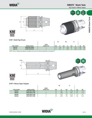KM50TS Shank Tools KM50TS™ Shank Tools Tap Chucks • Morse Tapers ST • Solid Tap Chuck D1 D2 L1 TQCS order number catalog number adapter size mm in mm in mm in kg lbs 3964133 KM50TSST1050M 1 19 .749 35 1.375 50 1.971 0,48 1.06 3964134 KM50TSST2075M 2 31 1.222 51 2.000 75 2.955 0,89 1.95 NOTE: Quick-change tap adapters available and must be ordered separately; see page I76. MT • Morse Taper Adapter D2 L1 CSWS order number catalog number system size mm in mm in kg lbs 3862043 KM50TSMT1095M 1 25 .984 95 3.740 0,57 1.26 3862044 KM50TSMT2110M 2 32 1.260 110 4.331 0,77 1.70 3862045 KM50TSMT3130M 3 40 1.575 130 5.118 1,12 2.47 3862046 KM50TSMT4150M 4 48 1.890 150 5.906 1,54 3.40 WWW.WIDIA.COM A175