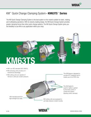 KM™ Quick Change Clamping System • KM63TS™ Series The KM Quick Change Clamping System is the best system on the market suitable for static, rotating, and multitasking operations. With its industry-leading design, the KM Quick Change System provides greater clamping forces than other quick-change systems. The KM Quick Change System gives you the flexibility to use KM on any application within your shop. ® KM63TS • KM is an ISO standard (ISO 26622). • KM clamping units provide a 4:1 mechanical advantage. The KM flange is designed to • KM cutting units are capable of provide ATC capability and to 100 bar (1,500 psi) coolant pressure. enable use of an RFID chip. The KM System’s superior rigidity is gained by the three points of contact the system develops when clamped. KM manufactured from high-strength tool steel. KM cutting units are equipped to use high-pressure coolant nozzles. A178 WWW.WIDIA.COM