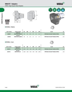 KM63TS Adapters KM63TS™ Adapters ETAR/L Single Square Shank Adapters ETAR/L • Metric order number catalog number B2 BW F HW L1 LPR nozzle kg right hand 2255547 KM63TSETAR2525M 98 25 37,5 25 35 60 PMT04526 COOLANT NOZZLE SPRAY 2,06 left hand 2255546 KM63TSETAL2525M 98 25 37,5 25 35 60 PMT04526 COOLANT NOZZLE SPRAY 2,06 ETAR/L • Inch order number catalog number B2 BW F HW L1 LPR nozzle lbs right hand 2384742 KM63TSETAR16 3.839 1.000 1.539 1.000 1.388 2.388 PMT08420 COOLANT NOZZLE SPRAY 4.58 left hand 2384743 KM63TSETAL16 3.839 1.000 1.539 1.000 1.388 2.388 PMT08420 COOLANT NOZZLE SPRAY 4.58 A180 WWW.WIDIA.COM