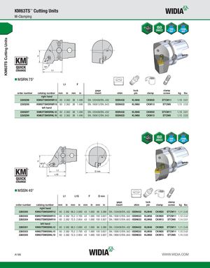 KM63TS Cutting Units KM63TS™ Cutting Units M-Clamping MSRN 75° L1 F gage lock clamp order number catalog number mm in mm in insert shim pin clamp screw kg lbs right hand 2265296 KM63TSMSRNR12 60 2.362 38 1.496 SN..120408/SN..432 ISSN432 KLM46 CKM20 STCM11 1,18 2.61 2265298 KM63TSMSRNR19 60 2.362 38 1.496 SN..190612/SN..643 ISSN633 KLM68 CKM13 STCM8 1,15 2.53 left hand 2265297 KM63TSMSRNL12 60 2.362 38 1.496 SN..120408/SN..432 ISSN432 KLM46 CKM20 STCM11 1,19 2.61 2265299 KM63TSMSRNL19 60 2.362 38 1.496 SN..190612/SN..643 ISSN633 KLM68 CKM13 STCM8 1,15 2.53 MSSN 45° L1 L1S F D min gage lock clamp order number catalog number mm in mm in mm in mm in insert shim pin clamp screw kg lbs right hand 2265300 KM63TSMSSNR12 60 2.362 68,3 2.690 43 1.693 86 3.386 SN..120408/SN..432 ISSN432 KLM46 CKM20 STCM11 1,11 2.45 2265302 KM63TSMSSNR15 60 2.362 70,2 2.765 43 1.693 100 3.937 SN..150612/SN..543 ISSN533 KLM58 CKM20 STCM11 1,10 2.42 2265304 KM63TSMSSNR19 60 2.362 72,5 2.854 43 1.693 100 3.937 SN..190612/SN..643 ISSN633 KLM68 CKM13 STCM8 1,14 2.51 left hand 2265301 KM63TSMSSNL12 60 2.362 68,3 2.690 43 1.693 86 3.386 SN..120408/SN..432 ISSN432 KLM46 CKM20 STCM11 1,11 2.45 2265303 KM63TSMSSNL15 60 2.362 70,2 2.765 43 1.693 100 3.937 SN..150612/SN..543 ISSN533 KLM58 CKM20 STCM11 1,10 2.42 2265305 KM63TSMSSNL19 60 2.362 72,5 2.854 43 1.693 100 3.937 SN..190612/SN..643 ISSN633 KLM68 CKM13 STCM8 1,15 2.53 A186 WWW.WIDIA.COM