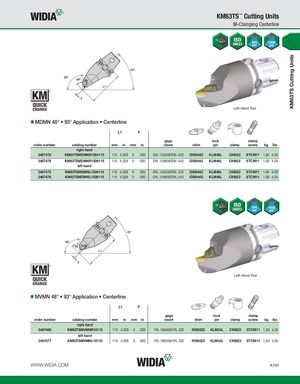 KM63TS Cutting Units KM63TS™ Cutting Units M-Clamping Centerline Left-Hand Tool MDMN 48° • 93° Application • Centerline L1 F gage lock clamp order number catalog number mm in mm in insert shim pin clamp screw kg lbs right hand 3487478 KM63TSMDMNR1504115 115 4.528 0 .000 DN..150408/DN..432 IDSN442 KLM46L CKM23 STCM11 1,84 4.05 3487479 KM63TSMDMNR1506115 115 4.528 0 .000 DN..150608/DN..442 IDSN442 KLM46L CKM23 STCM11 1,83 4.04 left hand 3487475 KM63TSMDMNL1504115 115 4.528 0 .000 DN..150408/DN..432 IDSN442 KLM46L CKM23 STCM11 1,84 4.05 3487476 KM63TSMDMNL1506115 115 4.528 0 .000 DN..150608/DN..442 IDSN442 KLM46L CKM23 STCM11 1,83 4.04 Left-Hand Tool MVMN 48° • 93° Application • Centerline L1 F gage lock clamp order number catalog number mm in mm in insert shim pin clamp screw kg lbs right hand 3487480 KM63TSMVMNR16115 115 4.528 0 .000 VN..160408/VN..332 IVSN322 KLM34L CKM23 STCM11 1,93 4.26 left hand 3487477 KM63TSMVMNL16115 115 4.528 0 .000 VN..160408/VN..332 IVSN322 KLM34L CKM23 STCM11 1,93 4.26 WWW.WIDIA.COM A191