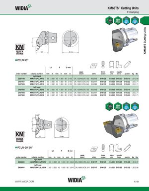 KM63TS Cutting Units KM63TS™ Cutting Units P-Clamping PCLN 95° L1 F D min gage lever shim toggle order number catalog number mm in mm in mm in insert shim screw pin lever punch kg lbs right hand 2257149 KM63TSPCLNR12 60 2.362 43 1.693 80 3.150 CN..120408/CN..432 512.112 514.123 513.023 511.023 515.018 1,21 2.66 2407957 KM63TSPCLNR16 60 2.362 43 1.693 80 3.150 CN..160612/CN..543 512.117 514.125 513.025 511.025 515.022 1,23 2.71 2407959 KM63TSPCLNR19 60 2.362 43 1.693 80 3.150 CN..190612/CN..643 512.123 514.133 513.033 511.033 515.022 1,23 2.71 left hand 2407956 KM63TSPCLNL12 60 2.362 43 1.693 80 3.150 CN..120408/CN..432 512.112 514.123 513.023 511.023 515.018 1,21 2.66 2407958 KM63TSPCLNL16 60 2.362 43 1.693 80 3.150 CN..160612/CN..543 512.117 514.125 513.025 511.025 515.022 1,23 2.71 2407960 KM63TSPCLNL19 60 2.362 43 1.693 80 3.150 CN..190612/CN..643 512.123 514.133 513.033 511.033 515.022 1,23 2.71 PCLN-2W 95° L1 F D min gage lever shim toggle order number catalog number mm in mm in mm in insert shim screw pin lever punch kg lbs right hand 2408003 KM63TSPCLNR162W 60 2.362 43 1.693 90 3.543 CN..160612/CN..543 512.117 514.125 513.025 511.025 515.022 1,35 2.97 left hand 2408004 KM63TSPCLNL162W 60 2.362 43 1.693 90 3.543 CN..160612/CN..543 512.117 514.125 513.025 511.025 515.022 1,35 2.98 WWW.WIDIA.COM A193
