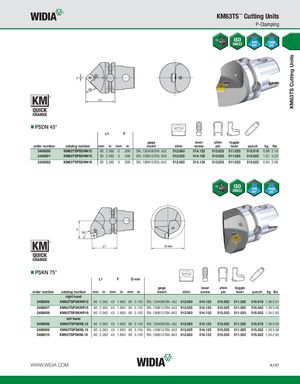 KM63TS Cutting Units KM63TS™ Cutting Units P-Clamping PSDN 45° L1 F gage lever shim toggle order number catalog number mm in mm in insert shim screw pin lever punch kg lbs 2408000 KM63TSPSDNN12 60 2.362 0 .000 SN..120408/SN..432 512.063 514.123 513.023 511.023 515.018 0,98 2.16 2408001 KM63TSPSDNN15 60 2.362 0 .000 SN..150612/SN..543 512.025 514.125 513.025 511.025 515.022 1,01 2.23 2408002 KM63TSPSDNN19 60 2.362 0 .000 SN..190612/SN..643 512.083 514.133 513.033 511.033 515.022 0,94 2.06 PSKN 75° L1 F D min gage lever shim toggle order number catalog number mm in mm in mm in insert shim screw pin lever punch kg lbs right hand 2408005 KM63TSPSKNR12 60 2.362 43 1.693 80 3.150 SN..120408/SN..432 512.063 514.123 513.023 511.023 515.018 1,36 3.01 2408007 KM63TSPSKNR15 60 2.362 43 1.693 80 3.150 SN..150612/SN..543 512.025 514.125 513.025 511.025 515.022 1,39 3.06 2408009 KM63TSPSKNR19 60 2.362 43 1.693 80 3.150 SN..190612/SN..643 512.083 514.133 513.033 511.033 515.022 1,34 2.95 left hand 2408006 KM63TSPSKNL12 60 2.362 43 1.693 80 3.150 SN..120408/SN..432 512.063 514.123 513.023 511.023 515.018 1,36 3.00 2408008 KM63TSPSKNL15 60 2.362 43 1.693 80 3.150 SN..150612/SN..543 512.025 514.125 513.025 511.025 515.022 1,39 3.06 2408010 KM63TSPSKNL19 60 2.362 43 1.693 80 3.150 SN..190612/SN..643 512.083 514.133 513.033 511.033 515.022 1,34 2.95 WWW.WIDIA.COM A197