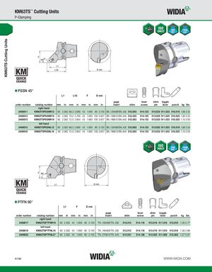 KM63TS Cutting Units KM63TS™ Cutting Units P-Clamping PSSN 45° L1 L1S F D min gage lever shim toggle order number catalog number mm in mm in mm in mm in insert shim screw pin lever punch kg lbs right hand 2408011 KM63TSPSSNR12 60 2.362 68,3 2.690 43 1.693 80 3.150 SN..120408/SN..432 512.063 514.123 513.023 511.023 515.018 1,06 2.33 2408013 KM63TSPSSNR15 60 2.362 70,2 2.765 43 1.693 100 3.937 SN..150612/SN..543 512.025 514.125 513.025 511.025 515.022 1,05 2.32 2408015 KM63TSPSSNR19 60 2.362 72,5 2.854 43 1.693 100 3.937 SN..190612/SN..643 512.083 514.133 513.033 511.033 515.022 1,13 2.50 left hand 2408012 KM63TSPSSNL12 60 2.362 68,3 2.690 43 1.693 80 3.150 SN..120408/SN..432 512.063 514.123 513.023 511.023 515.018 1,06 2.33 2408016 KM63TSPSSNL19 60 2.362 72,5 2.854 43 1.693 100 3.937 SN..190612/SN..643 512.083 514.133 513.033 511.033 515.022 1,13 2.50 PTFN 90° L1 F D min gage lever shim toggle order number catalog number mm in mm in mm in insert shim screw pin lever punch kg lbs right hand 2408017 KM63TSPTFNR16 60 2.362 43 1.693 80 3.150 TN..160408/TN..332 512.013 514.118 513.018 511.018 515.018 1,26 2.77 left hand 2408018 KM63TSPTFNL16 60 2.362 43 1.693 80 3.150 TN..160408/TN..332 512.013 514.118 513.018 511.018 515.018 1,30 2.86 2408022 KM63TSPTFNL27 60 2.362 43 1.693 80 3.150 TN..270612/TN..543 512.031 514.128 513.025 511.028 515.022 1,27 2.81 A198 WWW.WIDIA.COM