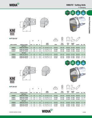 KM63TS Cutting Units KM63TS™ Cutting Units P-Clamping PTGN 90° L1 F gage lever shim toggle order number catalog number mm in mm in insert shim screw pin lever punch kg lbs right hand 2408023 KM63TSPTGNR16 60 2.362 43 1.693 TN..160408/TN..332 512.013 514.118 513.018 511.018 515.018 1,30 2.87 2408025 KM63TSPTGNR22 60 2.362 43 1.693 TN..220408/TN..432 512.023 514.123 513.023 511.023 515.018 1,27 2.80 2408027 KM63TSPTGNR27 60 2.362 43 1.693 TN..270612/TN..543 512.031 514.128 513.025 511.028 515.022 1,27 2.80 left hand 2408024 KM63TSPTGNL16 60 2.362 43 1.693 TN..160408/TN..332 512.013 514.118 513.018 511.018 515.018 1,28 2.82 2408026 KM63TSPTGNL22 60 2.362 43 1.693 TN..220408/TN..432 512.013 514.123 513.023 511.023 515.018 1,28 2.82 2408028 KM63TSPTGNL27 60 2.362 43 1.693 TN..270612/TN..543 512.031 514.128 513.025 511.028 515.022 1,27 2.80 PTJN 93° L1 F gage lever shim toggle order number catalog number mm in mm in insert shim screw pin lever punch kg lbs right hand 2408029 KM63TSPTJNR16 60 2.362 43 1.693 TN..160408/TN..332 512.013 514.118 513.018 511.018 515.018 1,33 2.92 2408031 KM63TSPTJNR22 60 2.362 43 1.693 TN..220408/TN..432 512.023 514.123 513.023 511.023 515.018 1,30 2.86 2408033 KM63TSPTJNR27 60 2.362 43 1.693 TN..270612/TN..543 512.031 514.128 513.025 511.028 515.022 1,26 2.71 left hand 2408030 KM63TSPTJNL16 60 2.362 43 1.693 TN..160408/TN..332 512.013 514.118 513.018 511.018 515.018 1,22 2.68 2408032 KM63TSPTJNL22 60 2.362 43 1.693 TN..220408/TN..432 512.023 514.123 513.023 511.023 515.018 1,30 2.86 2408034 KM63TSPTJNL27 60 2.362 43 1.693 TN..270612/TN..543 512.031 514.128 513.025 511.028 515.022 1,26 2.71 WWW.WIDIA.COM A199