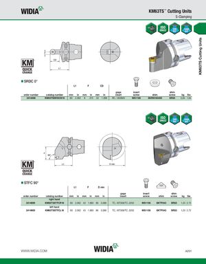 KM63TS Cutting Units KM63TS™ Cutting Units S-Clamping SRDC 0° L1 F CD gage insert shim order number catalog number mm in mm in mm in insert screw shim screw kg lbs 2414896 KM63TSSRDCN16 60 2.362 8 .315 33 1.299 RC..1605M0 MS1160 SKRN160400 SRS5 0,84 1.84 STFC 90° L1 F D min gage insert shim order number catalog number mm in mm in mm in insert screw shim screw kg lbs right hand 2414899 KM63TSSTFCR16 60 2.362 43 1.693 86 3.386 TC..16T308/TC..3252 MS1156 SKTP343 SRS3 1,23 2.72 left hand 2414900 KM63TSSTFCL16 60 2.362 43 1.693 86 3.386 TC..16T308/TC..3252 MS1156 SKTP343 SRS3 1,23 2.72 WWW.WIDIA.COM A201