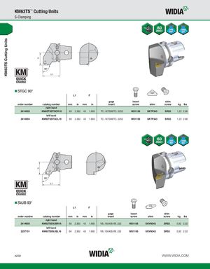 KM63TS Cutting Units KM63TS™ Cutting Units S-Clamping STGC 90° L1 F gage insert shim order number catalog number mm in mm in insert screw shim screw kg lbs right hand 2414903 KM63TSSTGCR16 60 2.362 43 1.693 TC..16T308/TC..3252 MS1156 SKTP343 SRS3 1,22 2.69 left hand 2414904 KM63TSSTGCL16 60 2.362 43 1.693 TC..16T308/TC..3252 MS1156 SKTP343 SRS3 1,22 2.69 SVJB 93° L1 F gage insert shim order number catalog number mm in mm in insert screw shim screw kg lbs right hand 2414905 KM63TSSVJBR16 60 2.362 43 1.693 VB..160408/VB..332 MS1156 SKVN343 SRS3 0,92 2.02 left hand 2257151 KM63TSSVJBL16 60 2.362 43 1.693 VB..160408/VB..332 MS1156 SKVN343 SRS3 0,92 2.02 A202 WWW.WIDIA.COM