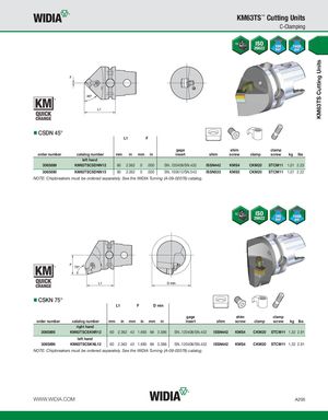 KM63TS Cutting Units KM63TS™ Cutting Units C-Clamping CSDN 45° L1 F gage shim clamp order number catalog number mm in mm in insert shim screw clamp screw kg lbs left hand 3065889 KM63TSCSDNN12 60 2.362 0 .000 SN..120408/SN.432 ISSN442 KMS4 CKM20 STCM11 1,01 2.23 3065890 KM63TSCSDNN15 60 2.362 0 .000 SN..150612/SN.543 ISSN533 KMS5 CKM20 STCM11 1,01 2.22 NOTE: Chipbreakers must be ordered separately. See the WIDIA Turning (A-09-02078) catalog. CSKN 75° L1 F D min gage shim clamp order number catalog number mm in mm in mm in insert shim screw clamp screw kg lbs right hand 3065895 KM63TSCSKNR12 60 2.362 43 1.693 86 3.386 SN..120408/SN.432 ISSN442 KMS4 CKM20 STCM11 1,32 2.91 left hand 3065896 KM63TSCSKNL12 60 2.362 43 1.693 86 3.386 SN..120408/SN.432 ISSN442 KMS4 CKM20 STCM11 1,32 2.91 NOTE: Chipbreakers must be ordered separately. See the WIDIA Turning (A-09-02078) catalog. WWW.WIDIA.COM A205