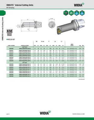 KM63TS Internal Cutting Units KM63TS™ Internal Cutting Units M-Clamping MCLN 95° D2 D min F L4 L1 gage order number catalog number mm in mm in mm in mm in mm in insert kg lbs right hand 2265329 KM63TSS25FMCLNR12 25 .98 32 1.26 17 .669 50 1.99 80 3.150 CN..120408/CN..432 0,90 1.99 2265327 KM63TSS25KMCLNR12 25 .98 32 1.26 17 .669 88 3.47 125 4.921 CN..120408/CN..432 1,14 2.52 2265343 KM63TSS32GMCLNR12 32 1.26 40 1.57 22 .866 62 2.44 90 3.543 CN..120408/CN..432 1,05 2.32 2265331 KM63TSS32LMCLNR12 32 1.26 40 1.57 22 .866 112 4.41 140 5.512 CN..120408/CN..432 1,37 3.01 2265347 KM63TSS40HMCLNR12 40 1.57 50 1.97 27 1.063 77 3.04 100 3.937 CN..120408/CN..432 1,30 2.87 2265345 KM63TSS40LMCLNR12 40 1.57 50 1.97 27 1.063 117 4.61 140 5.512 CN..120408/CN..432 1,69 3.72 2265351 KM63TSS50KMCLNR12 50 1.97 63 2.48 35 1.378 104 4.11 125 4.921 CN..120408/CN..432 1,99 4.40 2265349 KM63TSS50PMCLNR12 50 1.97 63 2.48 35 1.378 149 5.88 170 6.693 CN..120408/CN..432 2,68 5.91 left hand 2265330 KM63TSS25FMCLNL12 25 .98 32 1.26 17 .669 50 1.99 80 3.150 CN..120408/CN..432 0,90 1.99 2265328 KM63TSS25KMCLNL12 25 .98 32 1.26 17 .669 88 3.47 125 4.921 CN..120408/CN..432 1,14 2.52 2265344 KM63TSS32GMCLNL12 32 1.26 40 1.57 22 .866 62 2.44 90 3.543 CN..120408/CN..432 1,06 2.34 2265332 KM63TSS32LMCLNL12 32 1.26 40 1.57 22 .866 112 4.41 140 5.512 CN..120408/CN..432 1,37 3.01 2265348 KM63TSS40HMCLNL12 40 1.57 50 1.97 27 1.063 77 3.04 100 3.937 CN..120408/CN..432 1,33 2.93 2265346 KM63TSS40LMCLNL12 40 1.57 50 1.97 27 1.063 117 4.61 140 5.512 CN..120408/CN..432 1,69 3.72 2265352 KM63TSS50KMCLNL12 50 1.97 63 2.48 35 1.378 104 4.11 125 4.921 CN..120408/CN..432 2,01 4.43 2265350 KM63TSS50PMCLNL12 50 1.97 63 2.48 35 1.378 149 5.88 170 6.693 CN..120408/CN..432 2,68 5.91 (continued) A212 WWW.WIDIA.COM
