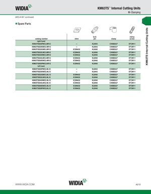 KM63TS Internal Cutting Units KM63TS™ Internal Cutting Units M-Clamping (MCLN 95° continued) Spare Parts lock clamp catalog number shim pin clamp screw right hand KM63TSS25FMCLNR12 — KLM43 CKM20LP STCM11 KM63TSS25KMCLNR12 — KLM43 CKM20LP STCM11 KM63TSS32GMCLNR12 ICSN432 KLM46 CKM20LP STCM11 KM63TSS32LMCLNR12 ICSN432 KLM46 CKM20LP STCM11 KM63TSS40HMCLNR12 ICSN432 KLM46 CKM20LP STCM11 KM63TSS40LMCLNR12 ICSN432 KLM46 CKM20LP STCM11 KM63TSS50KMCLNR12 ICSN432 KLM46 CKM20LP STCM11 KM63TSS50PMCLNR12 ICSN432 KLM46 CKM20LP STCM11 left hand KM63TSS25FMCLNL12 — KLM43 CKM20LP STCM11 KM63TSS25KMCLNL12 — KLM43 CKM20LP STCM11 KM63TSS32GMCLNL12 ICSN432 KLM46 CKM20LP STCM11 KM63TSS32LMCLNL12 ICSN432 KLM46 CKM20LP STCM11 KM63TSS40HMCLNL12 ICSN432 KLM46 CKM20LP STCM11 KM63TSS40LMCLNL12 ICSN432 KLM46 CKM20LP STCM11 KM63TSS50KMCLNL12 ICSN432 KLM46 CKM20LP STCM11 KM63TSS50PMCLNL12 ICSN432 KLM46 CKM20LP STCM11 WWW.WIDIA.COM A213