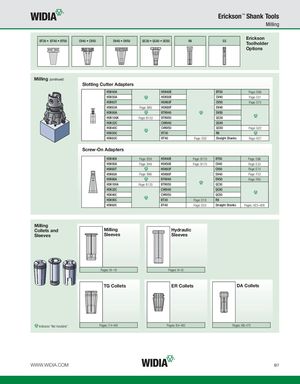 Erickson™ Shank Tools Milling BT30 • BT40 • BT50 CV40 • CV50 DV40 • DV50 QC30 • QC40 • QC50 R8 SS EricksonToolholder Options Milling (continued) Slotting Cutter Adapters HSK40A HSK40E BT50 Page: D86 HSK50A HSK50E CV40 Page: E31 HSK63T HSK63F CV50 Page: E73 HSK63A Page: B85 HSK80F DV40 HSK80A BTKV40 DV50 HSK100A Page: B133 BTKV50 QC30 HSK32C CVKV40 QC40 HSK40C CVKV50 QC50 Page: G22 HSK50C BT30 R8 HSK63C BT40 Page: D52 Straight Shanks Page: H27 Screw-On Adapters HSK40A Page: B39 HSK40E Page: B170 BT50 Page: D86 HSK50A Page: B49 HSK50E Page: B175 CV40 Page: E32 HSK63T HSK63F CV50 Page: E74 HSK63A Page: B86 HSK80F DV40 Page: F33 HSK80A BTKV40 DV50 Page: F65 HSK100A Page: B133 BTKV50 QC30 HSK32C CVKV40 QC40 HSK40C CVKV50 QC50 HSK50C BT30 Page: D18 R8 HSK63C BT40 Page: D53 Straight Shanks Pages: H23–H26 Milling Collets and Milling Hydraulic Sleeves Sleeves Sleeves Pages: I8–19 Pages: I4–I5 TG Collets ER Collets DA Collets Indicates “Not Available”. Pages: I14–I48 Pages: I54–I60 Pages: I65–I75 WWW.WIDIA.COM B7