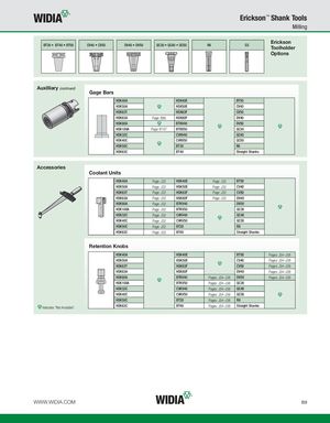 Erickson™ Shank Tools Milling BT30 • BT40 • BT50 CV40 • CV50 DV40 • DV50 QC30 • QC40 • QC50 R8 SS EricksonToolholder Options Auxilliary (continued) Gage Bars HSK40A HSK40E BT50 HSK50A HSK50E CV40 HSK63T HSK63F CV50 HSK63A Page: B90 HSK80F DV40 HSK80A BTKV40 DV50 HSK100A Page: B137 BTKV50 QC30 HSK32C CVKV40 QC40 HSK40C CVKV50 QC50 HSK50C BT30 R8 HSK63C BT40 Straight Shanks Accessories Coolant Units HSK40A Page: J32 HSK40E Page: J32 BT50 HSK50A Page: J32 HSK50E Page: J32 CV40 HSK63T Page: J32 HSK63F Page: J32 CV50 HSK63A Page: J32 HSK80F Page: J32 DV40 HSK80A Page: J32 BTKV40 DV50 HSK100A Page: J32 BTKV50 QC30 HSK32C Page: J32 CVKV40 QC40 HSK40C Page: J32 CVKV50 QC50 HSK50C Page: J32 BT30 R8 HSK63C Page: J32 BT40 Straight Shanks Retention Knobs HSK40A HSK40E BT50 Pages: J34–J38 HSK50A HSK50E CV40 Pages: J34–J38 HSK63T HSK63F CV50 Pages: J34–J38 HSK63A HSK80F DV40 Pages: J34–J38 HSK80A BTKV40 Pages: J34–J38 DV50 Pages: J34–J38 HSK100A BTKV50 Pages: J34–J38 QC30 HSK32C CVKV40 Pages: J34–J38 QC40 HSK40C CVKV50 Pages: J34–J38 QC50 HSK50C BT30 Pages: J34–J38 R8 Indicates “Not Available”. HSK63C BT40 Pages: J34–J38 Straight Shanks WWW.WIDIA.COM B9