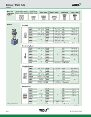Erickson™ Shank Tools Drilling Erickson HSK40A • HSK50A • HSK63T HSK32C • HSK40CToolholderHSK63A • HSK80A • HSK100AHSK50C • HSK63CHSK40E • HSK50EHSK63FP • HSK80FPBTKV40 • BTKV50CVKV40 • CVKV50 Options Drilling Shrink Fit HSK40A Pages: B26–B29 HSK40E Pages: B164–B166 BT50 Pages: D62–D65 HSK50A Pages: B42–B43 HSK50E Page: B173 CV40 Pages: E4–E7 HSK63T HSK63F Page: B177 CV50 Pages: E40–E43 HSK63A Pages: B62–B66 HSK80F Page: B181 DV40 Pages: F4–F7 HSK80A Pages: B94–B97 BTKV40 Pages: C4–C7 DV50 Pages: F40–F43 HSK100A Pages: B112–B115 BTKV50 Pages: C22–C25 QC30 HSK32C CVKV40 Pages: C40–C43 QC40 HSK40C CVKV50 Pages: C54–C57 QC50 HSK50C BT30 Pages: D4–D6 R8 HSK63C BT40 Pages: D22–D25 Straight Shanks Pages: H4–H5 Slim Line Hydraulic HSK40A Pages: B30–B31 HSK40E BT50 Pages: D66–D67 HSK50A HSK50E CV40 Pages: E8–E9 HSK63T HSK63F CV50 Pages: E44–E45 HSK63A Pages: B68–B69 HSK80F DV40 Pages: F8–F9 HSK80A BTKV40 DV50 Pages: F44–F45 HSK100A Pages: B116–B117 BTKV50 QC30 HSK32C CVKV40 QC40 HSK40C Pages: B144–B145 CVKV50 QC50 HSK50C BT30 R8 HSK63C BT40 Pages: D26–D27 Straight Shanks Hydraulic Chucks HSK40A Pages: B32–B33 HSK40E Page: B167 BT50 Pages: D68–D70 HSK50A Page: B44 HSK50E Page: B174 CV40 Pages: E10–E14 HSK63T HSK63F CV50 Pages: E47–E50 HSK63A Pages: B70–B71 HSK80F DV40 Pages: F10–F12 HSK80A Pages: B98–B99 BTKV40 DV50 Pages: F46–F47 HSK100A Pages: B118–B119 BTKV50 QC30 HSK32C Page: B139 CVKV40 QC40 HSK40C Page: B146 CVKV50 QC50 HSK50C Pages: B151–B152 BT30 Page: D7 R8 HSK63C Pages: B157–B158 BT40 Pages: D28–D30 Straight Shanks Milling Chucks HSK40A HSK40E BT50 Page: D71 HSK50A HSK50E CV40 Page: E15 HSK63T HSK63F CV50 Page: E51 HSK63A Page: B72 HSK80F DV40 Page: F13 HSK80A BTKV40 DV50 Page: F48 HSK100A Page: B120 BTKV50 QC30 HSK32C CVKV40 QC40 HSK40C CVKV50 QC50 HSK50C BT30 Page: D8 R8 Indicates “Not Available”. HSK63C BT40 Page: D31 Straight Shanks (continued) B10 WWW.WIDIA.COM