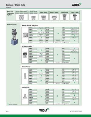 Erickson™ Shank Tools Drilling Erickson HSK40A • HSK50A • HSK63T HSK32C • HSK40CToolholderHSK63A • HSK80A • HSK100AHSK50C • HSK63CHSK40E • HSK50EHSK63FP • HSK80FPBTKV40 • BTKV50CVKV40 • CVKV50 Options Drilling (continued) Whistle Notch™ Adapters HSK40A Page: B36 HSK40E BT50 Pages: D77–D78 HSK50A HSK50E CV40 Pages: E24–E25 HSK63T HSK63F CV50 Pages: E62–E65 HSK63A Pages: B76–B77 HSK80F DV40 Pages: F25–F26 HSK80A Page: B104 BTKV40 DV50 Pages: F57–F58 HSK100A Pages: B124–B125 BTKV50 QC30 HSK32C CVKV40 QC40 Page: G13 HSK40C Page: B148 CVKV50 QC50 HSK50C Page: B154 BT30 Page: D14 R8 HSK63C Page: B160 BT40 Pages: D39–D40 Straight Shanks Straight Shanks HSK40A HSK40E BT50 HSK50A HSK50E CV40 Page: E28 HSK63T HSK63F CV50 Pages: E69–E70 HSK63A Page: B79 HSK80F DV40 HSK80A BTKV40 DV50 HSK100A Page: B127 BTKV50 QC30 HSK32C CVKV40 QC40 HSK40C CVKV50 QC50 HSK50C BT30 R8 HSK63C BT40 Page: D44 Straight Shanks Morse Tapers HSK40A HSK40E BT50 Page: D88 HSK50A HSK50E CV40 Page: E34 HSK63T HSK63F CV50 Page: E76 HSK63A Page: B87 HSK80F DV40 Page: F35 HSK80A BTKV40 DV50 Page: F67 HSK100A Page: B134 BTKV50 QC30 Page: G8 HSK32C CVKV40 QC40 Page: G16 HSK40C CVKV50 QC50 Page: G22 HSK50C BT30 R8 HSK63C BT40 Page: D55 Straight Shanks Jacobs/DIN HSK40A HSK40E BT50 Page: D88 HSK50A HSK50E CV40 Page: E35 HSK63T HSK63F CV50 Page: E77 HSK63A HSK80F DV40 HSK80A BTKV40 DV50 HSK100A BTKV50 QC30 Page: G9 HSK32C CVKV40 QC40 Page: G17 HSK40C CVKV50 QC50 HSK50C BT30 R8 Indicates “Not Available”. HSK63C BT40 Page: D55 Straight Shanks B12 WWW.WIDIA.COM