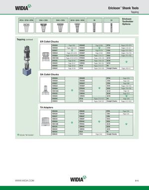 Erickson™ Shank Tools Tapping BT30 • BT40 • BT50 CV40 • CV50 DV40 • DV50 QC30 • QC40 • QC50 R8 SS EricksonToolholder Options Tapping (continued) ER Collet Chucks HSK40A Page: B35 HSK40E Page: B168 BT50 Pages: D73–D75 HSK50A Pages: B46–B47 HSK50E CV40 Pages: E19–E21 HSK63T HSK63F Page: B178 CV50 Pages: E57–E59 HSK63A Pages: B74–B75 HSK80F Page: B182 DV40 Pages: F16–F19 HSK80A Pages: B102–B103 BTKV40 Pages: C10–C11 DV50 Pages: F51–F53 HSK100A Pages: B122–B123 BTKV50 Pages: C28–C29 QC30 HSK32C Page: B140 CVKV40 Pages: C46–C47 QC40 HSK40C Page: B147 CVKV50 Pages: C60–C61 QC50 HSK50C Page: B153 BT30 Pages: D10–D11 R8 HSK63C Page: B159 BT40 Pages: D33–D35 Straight Shanks Pages: H8–H11 DA Collet Chucks HSK40A HSK40E BT50 Page: D76 HSK50A HSK50E CV40 Page: E22 HSK63T HSK63F CV50 Page: E60 HSK63A HSK80F DV40 Pages: F20–F23 HSK80A BTKV40 DV50 Pages: F54–F55 HSK100A BTKV50 QC30 Page: G5 HSK32C CVKV40 QC40 Page: G12 HSK40C CVKV50 QC50 HSK50C BT30 Pages: D12–D13 R8 Page: G26 HSK63C BT40 Pages: D36–D37 Straight Shanks Pages: H12–H22 TA Adapters HSK40A HSK40E BT50 Page: D78 HSK50A HSK50E CV40 Page: E25 HSK63T HSK63F CV50 HSK63A HSK80F DV40 HSK80A BTKV40 DV50 HSK100A BTKV50 QC30 HSK32C CVKV40 QC40 HSK40C CVKV50 QC50 HSK50C BT30 R8 Indicates “Not Available”. HSK63C BT40 Page: D40 Straight Shanks WWW.WIDIA.COM B15