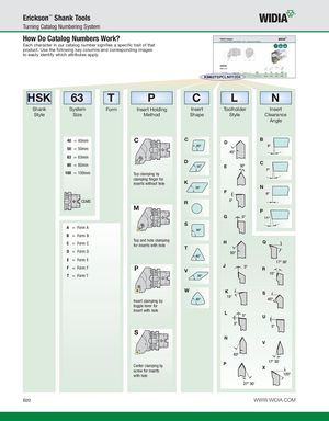 Erickson™ Shank Tools Turning Catalog Numbering System How Do Catalog Numbers Work? Each character in our catalog number signifies a specific trait of that product. Use the following key columns and corresponding images to easily identify which attributes apply. KM63TSPCLNR1204 HSK 63 T P C L N Shank System Form Insert Holding Insert Toolholder Insert Style Size Method Shape Style Clearance Angle 40 = 40mm C C B 50 = 50mm 63 = 63mm 80 = 80mm D C 100 = 100mm Top clamping by clamping finger for inserts without hole K N CSMS R M P S A = Form A B = Form B Top and hole clamping C = Form C for inserts with hole T D = Form D E = Form E F = Form F P V T = Form T W Insert clamping by toggle lever for insert with hole S Center clamping by screw for inserts with hole B20 WWW.WIDIA.COM