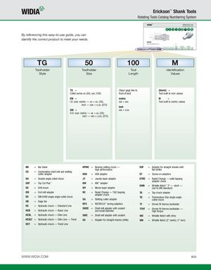Erickson™ Shank Tools Rotating Tools Catalog Numbering System By referencing this easy-to-use guide, you can identify the correct product to meet your needs. KM63ACHTG50100M TG 50 100 M Toolholder Toolholder Tool Identification Style Size Length Values TG = (Taper gage line to (blank) = Collet series xx (50), xxx (100) front of tool) Tool built to inch values EM = metric M = I.D. size: metric — xx = xx, (20); xxx = xxx Tool built to metric values inch — xxx = x.xx, (075) inch SM = xxx = x.xx O.D. size: metric — xx = xx, (20); inch — xxx = x.xx, (075) BB = Bar blank HPMC = Bearing milling chuck — SSF = Adapter for straight shanks with high performance flat (drills) CS = Combination shell mill and slotting cutter adapter HSK = HSK adapter ST = Screw-on adapters DA = Double-angle collet chuck JT = Jacobs taper adapter STRC = Rapid Change — solid tapping adapter chuck DAT = Top Cut Plus™ KM = KM™ adapter SWN = Whistle Notch™ 2° — short — DC = Drill chuck MT = Morse taper adapter (not to DIN standard) EM = End mill adapter RC = Rapid Change — T&C tapping TA = Tap chuck adapter adapter chuck ER = DIN 6499 single-angle collet chuck TG = Tremendous Grip single-angle GB = Gage bar SA = Slotting cutter adapter collet chuck RFX = ROTAFLEX™ boring adaptersHC=Hydraulic chuck — Standard LineTT=Shrink Fit thermo toolholder HCB = Hydraulic chuck — Basic Line SM2C = Shell mill adapter with coolantand small diameterTTHT=Shrink Fit thermo toolholder —high torque HCSL = Hydraulic chuck — Slim Line SMC = Shell mill adapter with coolant WD = Whistle Notch with drive HCSLT = Hydraulic chuck — Slim Line — Trend SS = Adapter for straight shanks (drills) WN = Whistle Notch (2° metric; 5° inch) HCT = Hydraulic chuck — Trend Line WWW.WIDIA.COM B23