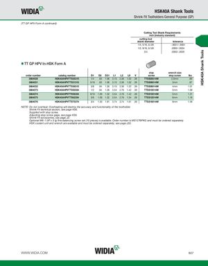 HSK40A Shank Tools HSK40A Shank Tools Shrink Fit Toolholders General Purpose (GP) (TT GP HPV Form A continued) Cutting Tool Shank Requirements inch (industry standard) cutting tool shank diameter tolerance 1/4, 5/16, & 3/8 -.0001/-.0004 1/2, 9/16, & 5/8 .0000/-.0004 3/4 .0000/-.0005 TT GP HPV In-HSK Form A stop wrench size order number catalog number D1 D2 D21 L1 L2 L9 V screw stop screw lbs 3864029 HSK40AHPVTT025315 1/4 .83 1.06 3.15 2.36 1.02 .39 TTSS05014M 2,5mm .89 3864031 HSK40AHPVTT031315 5/16 .83 1.06 3.15 2.36 1.02 .39 TTSS06014M 3mm .87 3864032 HSK40AHPVTT038315 3/8 .94 1.26 3.15 2.36 1.22 .39 TTSS08014M 4mm 1.01 3864073 HSK40AHPVTT050354 1/2 .94 1.26 3.54 2.76 1.42 .39 TTSS10014M 5mm 1.09 3864074 HSK40AHPVTT056354 9/16 1.06 1.32 3.54 2.76 1.42 .39 TTSS10014M 5mm 1.21 3864075 HSK40AHPVTT062354 5/8 1.06 1.32 3.54 2.76 1.54 .39 TTSS12014M 6mm 1.16 3864076 HSK40AHPVTT075374 3/4 1.30 1.61 3.74 3.74 1.61 .39 TTSS16014M 8mm 1.49 NOTE: Do not overheat. Overheating will destroy the accuracy and functionality of the toolholder. Shrink Fit technical section, see page K56. Supplied with stop screw. Adjusting stop screw gage, see page K59. Shrink Fit accessories, see page J2. Optional M6~1.0P x 5 lg fine-balancing screw set (10 pieces) is available. Order number is MS1276PKG and must be ordered separately. HSK coolant unit and wrench are available and must be ordered separately; see page J32. WWW.WIDIA.COM B27