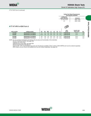 HSK40A Shank Tools HSK40A Shank Tools Shrink Fit Toolholders High Torque (HT) (TT HT HPV Form A continued) Cutting Tool Shank Requirements inch (industry standard) cutting tool shank diameter tolerance 1/2, 9/16, & 5/8 .0000/-.0004 3/4 .0000/-.0005 TT HT HPV In-HSK Form A stop wrench size order number catalog number D1 D2 D21 L1 L2 L9 V screw stop screw lbs 3872696 HSK40AHPVTTHT050354 1/2 .94 1.26 3.54 2.76 1.42 .39 TTSS10014M 5mm 1.09 3872697 HSK40AHPVTTHT056354 9/16 1.06 1.32 3.54 2.76 1.42 .39 TTSS10014M 5mm 1.21 3872698 HSK40AHPVTTHT062354 5/8 1.06 1.32 3.54 2.76 1.54 .39 TTSS12014M 6mm 1.16 3872699 HSK40AHPVTTHT075374 3/4 1.30 1.61 3.74 3.74 1.61 .39 TTSS16014M 8mm 1.49 NOTE: Do not overheat. Overheating will destroy the accuracy and functionality of the toolholder. Shrink Fit technical section, see page K56. Supplied with stop screw. Adjusting stop screw gage, see page K59. Shrink Fit accessories, see page J2. Optional M6~1.0P x 5 lg fine-balancing screw set (10 pieces) is available. Order number is MS1276PKG and must be ordered separately. HSK coolant unit and wrench are available and must be ordered separately; see page J32. WWW.WIDIA.COM B29