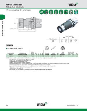 HSK40A Shank Tools HSK40A Shank Tools TG Single-Angle Collet Chucks • Tremendous Grip (3:1 advantage). collet series Collet Capacity mm inch TG collet series min max min max TG50 1,1 13,5 1/32 17/32 TG75 2,6 20,0 3/64 3/4 TG Round-HSK Form A collet stop wrench size order number catalog number series D11 L1 L9 V locknut wrench Nm screw stop screw kg 2455912 HSK40ATG050080M TG50 38 80 42,0 5 LNA050M HSW34M 68 SS056041G 4mm & 5/32 0,45 2455993 HSK40ATG075090M TG75 50 90 54,0 7 LNA075M HSW45M 136 SS081041G 4mm & 5/32 0,69 NOTE: Collet must be loaded into locknut first. Before loading into the chuck body, insert the cutting tool, then tighten to the recommended tightening torque. Collet chuck technical section, see page K74. Supplied with locknut and stop screw. Locknut wrench must be ordered separately. Interchangeable locknuts, coolant-style locknuts, and coolant disks are available and must be ordered separately; see page J6. Stop screw coolant caps are available and must be ordered separately; see page J22. Balanceable/interchangeable locknuts are available and must be ordered separately; see page J3. TG standard straight-bore collets, see page I10. TG tap collets, see page I10. HSK coolant unit and wrench are available and must be ordered separately; see page J32. B34 WWW.WIDIA.COM