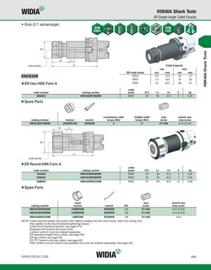 HSK40A Shank Tools HSK40A Shank Tools ER Single-Angle Collet Chucks • Grip (2:1 advantage). collet series Collet Capacity mm inch ER collet series min max min max ER16 0,5 10,0 .02 .41 ER25 1,0 16,0 .04 .63 ER Hex-HSK Form A ER32 2,0 20,0 .08 .81 collet order number catalog number series D11 L1 L9 V kg 2260343 HSK40AER16080M ER16 28 80 27,0 5 0,40 Spare Parts counterbore collet straight collet stop wrench size catalog number locknut wrench torque (Nm) torque (Nm) screw stop screw HSK40AER16080M LNHSER16M OEW25M 40 56 571.068 4mm & 5/32 collet series ER Round-HSK Form A collet order number catalog number series D11 L1 L9 V kg 1833498 HSK40AER25080M ER25 42 80 31,0 5 0,50 2260344 HSK40AER32090M ER32 50 90 46,0 5 0,56 2386935 HSK40AER32100M ER32 50 100 40,0 10 0,69 Spare Parts round stop wrench size catalog number locknut wrench Nm screw stop screw HSK40AER25080M LNSER25M ER25WM 104 571.062 4mm & 5/32 HSK40AER32090M LNSER32M ER32WM 136 571.062 4mm & 5/32 HSK40AER32100M LNER32M ER32WM 136 571.062 4mm NOTE: Collet must be loaded into locknut first. Before loading into the chuck body, insert the cutting tool, then tighten to the recommended tightening torque. Collet chuck technical section, see page K74. Supplied with locknut and stop screw. Locknut wrench must be ordered separately. ER standard straight-bore collets, see page I50. ER tap collets, see page I58. ER TCT tension-only tap collets, see page I60. HSK coolant unit and wrench are available and must be ordered separately; see page J32. WWW.WIDIA.COM B35