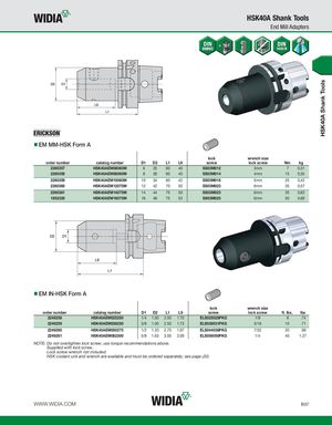 HSK40A Shank Tools HSK40A Shank Tools End Mill Adapters EM MM-HSK Form A lock wrench size order number catalog number D1 D2 L1 L9 screw lock screw Nm kg 2260357 HSK40AEM06060M 6 25 60 40 SS03M012 3mm 7 0,31 2260358 HSK40AEM08060M 8 28 60 40 SS03M014 4mm 15 0,35 2260359 HSK40AEM10060M 10 34 60 42 SS03M018 5mm 25 0,42 2260360 HSK40AEM12070M 12 42 70 50 SS03M023 6mm 35 0,57 2260361 HSK40AEM14075M 14 44 75 50 SS03M023 6mm 35 0,63 1852320 HSK40AEM16075M 16 48 75 53 SS03M025 6mm 50 0,69 EM IN-HSK Form A lock wrench size order number catalog number D1 D2 L1 L9 screw lock screw ft. lbs. lbs 2249258 HSK40AEM025250 1/4 1.00 2.50 1.70 ELS025025PKG 1/8 8 .74 2249259 HSK40AEM038250 3/8 1.00 2.50 1.73 ELS038031PKG 3/16 15 .71 2249260 HSK40AEM050275 1/2 1.33 2.75 1.97 ELS044038PKG 7/32 20 .99 2249261 HSK40AEM062300 5/8 1.63 3.00 2.09 ELS056050PKG 1/4 40 1.27 NOTE: Do not overtighten lock screw; use torque recommendations above. Supplied with lock screw. Lock screw wrench not included. HSK coolant unit and wrench are available and must be ordered separately; see page J32. WWW.WIDIA.COM B37