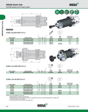 HSK40A Shank Tools HSK40A Shank Tools Shell Mill Adapters with Through Coolant SMC Cap MM-HSK Form A lock drive wrench size order number catalog number D1 D2 L1 screw key lock screw kg 3872589 HSK40ASM2C16050M 16 38 50 MS1294 KDK16M 6mm 0,44 3872588 HSK40ASMC16050M 16 44 50 MS1294 KDK16M 6mm 0,49 3872591 HSK40ASM2C22050M 22 42 50 MS1234 — 8mm 0,50 3872590 HSK40ASMC22050M 22 49 50 MS1234 KDK22M 8mm 0,55 SMC Lock MM-HSK Form A lock drive wrench size order number catalog number D1 D2 L1 screw key lock screw kg 3872592 HSK40ASMC27075M 27 60 75 KLSS27M KDK27M 10mm 1,01 SMC Lock IN-HSK Form A lock drive wrench size order number catalog number D1 D2 L1 screw key lock screw lbs 3762350 HSK40ASM2C050200 1/2 1.20 2.00 KLS05 KDK04 3/16 .85 3762349 HSK40ASMC050200 1/2 1.44 2.00 KLS05 KDK04 3/16 .95 3762352 HSK40ASM2C075200 3/4 1.46 2.00 KLS07 — 1/4 1.03 3762351 HSK40ASMC075200 3/4 1.75 2.00 KLS07 KDK05 1/4 1.14 3762404 HSK40ASM2C100200 1 2.19 2.00 KLS10 KDK06 5/16 1.45 3762403 HSK40ASMC100200 1 2.75 2.00 KLS10 KDK06 5/16 1.73 NOTE: Do not overtighten lock screw. Supplied with lock screw and drive keys. Interchangeable coolant-style lock screws are available and must be ordered separately; see page J26. Lock screw wrench not included. For HSK coolant unit and wrench, see page J32. B38 WWW.WIDIA.COM