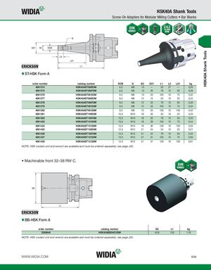 HSK40A Shank Tools HSK40A Shank Tools Screw-On Adapters for Modular Milling Cutters • Bar Blanks ST-HSK Form A order number catalog number DCB G D2 D21 L1 L2 L21 kg 4061374 HSK40AST06053M 6,5 M6 10 — 53 27 — 0,20 4061375 HSK40AST06078M 6,5 M6 10 20 78 10 50 0,26 4061376 HSK40AST06103M 6,5 M6 10 23 103 10 75 0,32 4061377 HSK40AST08053M 8,5 M8 13 15 53 10 25 0,22 4061378 HSK40AST08078M 8,5 M8 13 23 78 10 50 0,30 4061379 HSK40AST08103M 8,5 M8 13 23 103 10 75 0,34 4061380 HSK40AST08128M 8,5 M8 13 25 128 10 100 0,42 4061381 HSK40AST10053M 10,5 M10 18 20 53 10 25 0,25 4061382 HSK40AST10078M 10,5 M10 18 25 78 10 50 0,33 4061423 HSK40AST10103M 10,5 M10 18 28 103 10 75 0,44 4061424 HSK40AST10128M 10,5 M10 18 30 128 10 100 0,55 4061425 HSK40AST12053M 12,5 M12 21 24 53 10 25 0,27 4061426 HSK40AST12078M 12,5 M12 21 24 78 10 50 0,34 4061427 HSK40AST12103M 12,5 M12 21 31 103 10 75 0,50 4061428 HSK40AST12128M 12,5 M12 21 31 128 10 100 0,61 NOTE: HSK coolant unit and wrench are available and must be ordered separately; see page J32. • Machinable front 32–38 RW C. BB-HSK Form A order number catalog number D2 L1 kg 2260649 HSK40ABB040120M 40,8 120 1,16 NOTE: HSK coolant unit and wrench are available and must be ordered separately; see page J32. WWW.WIDIA.COM B39