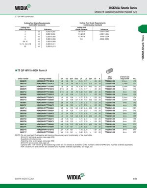 HSK50A Shank Tools HSK50A Shank Tools Shrink Fit Toolholders General Purpose (GP) (TT GP HPV continued) Cutting Tool Shank Requirements Cutting Tool Shank Requirements metric (ISO standard) inch (industry standard) cutting tool cutting tool shank diameter tolerance shank diameter tolerance 3 h4 0,000/-0,003 1/8 & 3/16 -.0001/-.0003 4 h4 0,000/-0,004 1/4 & 3/8 -.0001/-.0004 5 h5 0,000/-0,005 1/2 & 5/8 .0000/-.0004 6 h6 0,000/-0,008 3/4 .0000/-.0005 8 & 10 h6 0,000/-0,009 12, 14, 16, & 18 h6 0,000/-0,011 20 h6 0,000/-0,013 TT GP HPV In-HSK Form A stop wrench size order number catalog number D1 D2 D21 D22 L1 L2 L21 L9 V screw stop screw lbs 3863678 HSK50AHPVTT012315 1/8 .35 .59 — 3.15 1.77 — .63 .39 TTSS05014M 2,5mm 1.10 3863705 HSK50AHPVTT012472 1/8 .35 .59 .68 4.72 1.97 3.35 .63 .39 TTSS05014M 2,5mm 1.22 3863711 HSK50AHPVTT012630 1/8 .35 .59 .79 6.30 1.97 4.92 .63 .39 TTSS05014M 2,5mm 1.40 3863679 HSK50AHPVTT018315 3/16 .35 .59 — 3.15 1.77 — .59 .39 TTSS06014M 3mm 1.10 3863712 HSK50AHPVTT018630 3/16 .35 .59 .79 6.30 1.97 4.92 .59 .39 TTSS06014M 3mm 1.40 3863680 HSK50AHPVTT025315 1/4 .83 1.06 — 3.15 2.13 — 1.02 .39 TTSS05014M 2,5mm 1.26 3863706 HSK50AHPVTT025472 1/4 .83 1.06 — 4.72 3.35 — 1.02 .39 TTSS05014M 2,5mm 1.74 3863713 HSK50AHPVTT025630 1/4 .83 1.06 1.27 6.30 1.97 4.92 1.02 .39 TTSS05014M 2,5mm 2.26 3863681 HSK50AHPVTT038335 3/8 .94 1.26 — 3.35 2.32 — 1.22 .39 TTSS08014M 4mm 1.42 3863707 HSK50AHPVTT038472 3/8 .94 1.26 — 4.72 3.35 — 1.22 .39 TTSS08014M 4mm 1.96 3863714 HSK50AHPVTT038630 3/8 .94 1.26 1.43 6.30 2.48 4.92 1.22 .39 TTSS08014M 4mm 2.61 3863682 HSK50AHPVTT050354 1/2 .94 1.26 — 3.54 2.52 — 1.42 .39 TTSS10014M 5mm 1.43 3863708 HSK50AHPVTT050472 1/2 .94 1.26 — 4.72 3.35 — 1.42 .39 TTSS10014M 5mm 1.91 3863715 HSK50AHPVTT050630 1/2 .94 1.26 1.43 6.30 2.48 4.92 1.42 .39 TTSS10014M 5mm 2.55 3863703 HSK50AHPVTT062374 5/8 1.06 1.33 — 3.74 2.72 — 1.54 .39 TTSS12014M 6mm 1.58 3863709 HSK50AHPVTT062472 5/8 1.06 1.33 — 4.72 3.35 — 1.54 .39 TTSS12014M 6mm 2.01 3863716 HSK50AHPVTT062630 5/8 1.06 1.33 1.52 6.30 2.24 4.92 1.54 .39 TTSS12014M 6mm 2.77 3863704 HSK50AHPVTT075394 3/4 1.30 1.61 — 3.94 2.92 — 1.61 .39 TTSS16014M 8mm 2.00 3863710 HSK50AHPVTT075472 3/4 1.30 1.61 — 4.72 3.70 — 1.61 .39 TTSS16014M 8mm 2.44 3863717 HSK50AHPVTT075630 3/4 1.30 1.61 — 6.30 5.28 — 1.61 .39 TTSS16014M 8mm 3.33 NOTE: Do not overheat. Overheating will destroy the accuracy and functionality of the toolholder. Shrink Fit technical section, see page K56. Supplied with stop screw. Adjusting stop screw gage, see page K59. Shrink Fit accessories, see page J2. Optional M6~1.0P x 5mm lg fine-balancing screw set (10 pieces) is available. Order number is MS1276PKG and must be ordered separately. HSK coolant unit and wrench are available and must be ordered separately; see page J32. WWW.WIDIA.COM B43