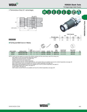 HSK50A Shank Tools HSK50A Shank Tools TG Single-Angle Collet Chucks • Tremendous Grip (3:1 advantage). collet series Collet Capacity mm inch TG collet series min max min max TG50 1,1 13,5 1/32 17/32 TG75 2,6 20,0 3/64 3/4 TG Round-HSK Form A • Metric collet stop wrench size stop screw order number catalog number series D11 L1 L9 V locknut wrench Nm screw stop screw cone cap kg 1307819 HSK50ATG050100M TG50 38 100 42 12 LNA050M HSW34M 68 SS056041G 4mm & 5/32 SSCC056 0,86 1307821 HSK50ATG075115M TG75 50 115 54 11 LNA075M HSW45M 136 SS081041G 4mm & 5/32 SSCC081 0,79 NOTE: Collet must be loaded into locknut first. Before loading into the chuck body, insert the cutting tool, then tighten to the recommended tightening torque. Collet chuck technical section, see page K74. Supplied with locknut and stop screw. Locknut wrench must be ordered separately. Interchangeable locknuts, coolant-style locknuts, and coolant disks are available and must be ordered separately; see page J6. Stop screw coolant caps are available and must be ordered separately; see page J22. Balanceable/interchangeable locknuts are available and must be ordered separately; see page J3. TG standard straight-bore collets, see page I10. TG tap collets, see page I10. HSK coolant unit and wrench are available and must be ordered separately; see page J32. WWW.WIDIA.COM B45