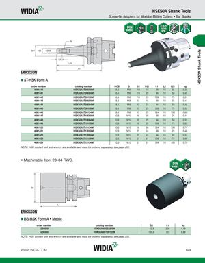 HSK50A Shank Tools HSK50A Shank Tools Screw-On Adapters for Modular Milling Cutters • Bar Blanks ST-HSK Form A order number catalog number DCB G D2 D21 L1 L2 L21 kg 4061440 HSK50AST06059M 6,5 M6 10 10 59 10 25 0,39 4061441 HSK50AST06084M 6,5 M6 10 20 84 10 50 0,45 4061442 HSK50AST06109M 6,5 M6 10 23 109 10 75 0,51 4061443 HSK50AST08059M 8,5 M8 13 15 59 10 25 0,41 4061444 HSK50AST08084M 8,5 M8 13 23 84 10 50 0,48 4061445 HSK50AST08109M 8,5 M8 13 23 109 10 75 0,53 4061446 HSK50AST08134M 8,5 M8 13 25 134 10 100 0,60 4061447 HSK50AST10059M 10,5 M10 18 20 59 10 25 0,44 4061448 HSK50AST10084M 10,5 M10 18 25 84 10 50 0,53 4061449 HSK50AST10109M 10,5 M10 18 28 109 10 75 0,63 4061450 HSK50AST10134M 10,5 M10 18 30 134 10 100 0,74 4061451 HSK50AST12059M 12,5 M12 21 24 59 10 25 0,46 4061452 HSK50AST12084M 12,5 M12 21 24 84 10 50 0,53 4061453 HSK50AST12109M 12,5 M12 21 31 109 10 75 0,69 4061454 HSK50AST12134M 12,5 M12 21 31 134 10 100 0,79 NOTE: HSK coolant unit and wrench are available and must be ordered separately; see page J32. • Machinable front 28–34 RWC. BB-HSK Form A • Metric order number catalog number D2 L1 kg 1256059 HSK50ABB063200M 63,8 200 4,49 1256060 HSK50ABB100125M 100,8 125 5,69 NOTE: HSK coolant unit and wrench are available and must be ordered separately; see page J32. WWW.WIDIA.COM B49