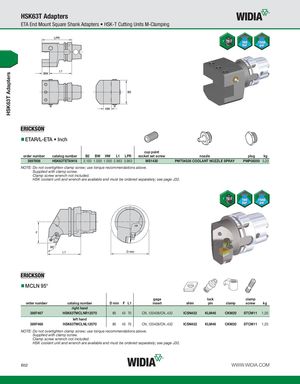HSK63T Adapters HSK63T Adapters ETA End Mount Square Shank Adapters • HSK-T Cutting Units M-Clamping ETAR/L-ETA • Inch cup point order number catalog number B2 BW HW L1 LPR socket set screw nozzle plug kg 3897806 HSK63TETAN16 3.150 1.000 1.000 2.963 3.963 MS1430 PMT04526 COOLANT NOZZLE SPRAY PMP08350 3,20 NOTE: Do not overtighten clamp screw; use torque recommendations above. Supplied with clamp screw. Clamp screw wrench not included. HSK coolant unit and wrench are available and must be ordered separately; see page J32. MCLN 95° gage lock clamp order number catalog number D min F L1 insert shim pin clamp screw kg right hand 3897467 HSK63TMCLNR12070 80 45 70 CN..120408/CN..432 ICSN432 KLM46 CKM20 STCM11 1,20 left hand 3897468 HSK63TMCLNL12070 80 45 70 CN..120408/CN..432 ICSN432 KLM46 CKM20 STCM11 1,20 NOTE: Do not overtighten clamp screw; use torque recommendations above. Supplied with clamp screw. Clamp screw wrench not included. HSK coolant unit and wrench are available and must be ordered separately; see page J32. B52 WWW.WIDIA.COM