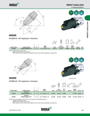 HSK63T Cutting Units HSK63T Cutting Units P-Clamping Systems PCMN 50° • 95° Application • Centerline gage lever shim toggle order number catalog number F L1 insert shim lock screw pin lever punch kg 3575690 HSK63TPCMNN12115 0 115 CN..120408/CN..432 512.112 514.123 513.023 511.023 515.018 1,64 NOTE: Supplied with clamp screw. Clamp screw wrench not included. HSK coolant unit and wrench are available and must be ordered separately; see page J32. Left-Hand Tool PDMN 48° • 93° Application • Centerline gage lever shim toggle order number catalog number F L1 insert shim lock screw pin wrench lever punch kg right hand 3897470 HSK63TPDMNR15115 0 115 DN..150608/DN..442 512.153 514.128 513.023 — 511.024 515.018 1,46 left hand 3575691 HSK63TPDMNL15115 0 115 DN..150608/DN..442 512.153 514.128 513.023 K15IP 511.024 515.018 1,62 NOTE: Do not overtighten clamp screw; use torque recommendations above. Supplied with clamp screw. Clamp screw wrench not included. HSK coolant unit and wrench are available and must be ordered separately; see page J32. WWW.WIDIA.COM B53
