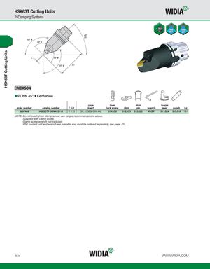 HSK63T Cutting Units HSK63T Cutting Units P-Clamping Systems PDNN 45° • Centerline gage lever shim toggle order number catalog number F L1 insert lock screw shim pin wrench lever punch kg 3897469 HSK63TPDNNN15115 0 115 DN..150608/DN..442 514.128 512.153 513.023 K15IP 511.024 515.018 1,61 NOTE: Do not overtighten clamp screw; use torque recommendations above. Supplied with clamp screw. Clamp screw wrench not included. HSK coolant unit and wrench are available and must be ordered separately; see page J32. B54 WWW.WIDIA.COM