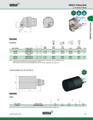 HSK63T Cutting Units HSK63T Cutting Units LT Threading • Blanks LSS 90° gage insert shim clamp order number catalog number F L1 insert screw screw shim assembly kg right hand 3897556 HSK63TLSSR16 32 70 LT16ER SSA3T SSY3T SMYE3 CKC3 1,12 3897558 HSK63TLSSR22 32 70 LT22ER SSA4T SSY4T SMYE4 CKC4 1,11 left hand 3897557 HSK63TLSSL16 32 70 LT16EL SSA3T SSY3T SMYI3 CKC3 1,12 3897559 HSK63TLSSL22 32 70 LT22EL SSA4T SSY4T SMYI4 CKC4 1,11 NOTE: Cutting units are supplied with insert screw and clamp assembly. However, tools are designed to use either the insert screw or the clamp assembly, not both. HSK coolant unit and wrench are available and must be ordered separately; see page J32. • Machinable front 32–38 RW C. BN D2 L1 order number catalog number mm in mm in kg 3897546 HSK63TBN115200M 115,00 4.528 200,00 7.874 13,74 NOTE: HSK coolant unit and wrench are available and must be ordered separately; see page J32. WWW.WIDIA.COM B57