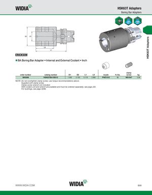 HSK63T Adapters HSK63T Adapters Boring Bar Adapters BA Boring Bar Adapter • Internal and External Coolant • Inch clamp order number catalog number D1 D2 L1 L9 nozzle ft. lbs. screw kg 3892898 HSK63TBA150512 1.500 3.150 5.118 2.992 PWZ1012 90 MS1947 3,58 NOTE: Do not overtighten clamp screw; use torque recommendations above. Supplied with clamp screw. Clamp screw wrench not included. HSK coolant unit and wrench are available and must be ordered separately; see page J32. For bushings, see page A286. WWW.WIDIA.COM B59