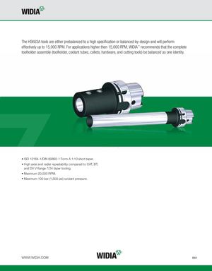 The HSK63A tools are either prebalanced to a high specification or balanced-by-design and will perform effectively up to 15,000 RPM. For applications higher then 15,000 RPM, WIDIA™ recommends that the complete toolholder assembly (toolholder, coolant tubes, collets, hardware, and cutting tools) be balanced as one identity. • ISO 12164-1/DIN 69893-1 Form A 1:10 short taper. • High axial and radial repeatability compared to CAT, BT, and DV V-flange 7/24 taper tooling. • Maximum 20,500 RPM. • Maximum 100 bar (1,500 psi) coolant pressure. WWW.WIDIA.COM B61