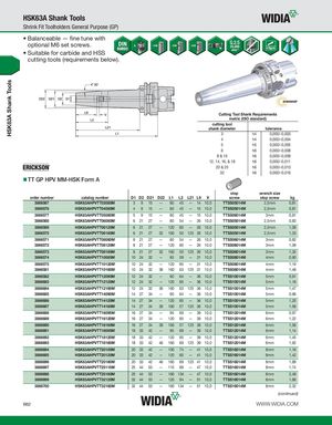 HSK63A Shank Tools HSK63A Shank Tools Shrink Fit Toolholders General Purpose (GP) • Balanceable — fine tune with optional M6 set screws. • Suitable for carbide and HSS cutting tools (requirements below). Cutting Tool Shank Requirements metric (ISO standard) cutting tool shank diameter tolerance 3 h4 0,000/-0,003 4 h4 0,000/-0,004 5 h5 0,000/-0,005 6 h6 0,000/-0,008 8 & 10 h6 0,000/-0,009 12, 14, 16, & 18 h6 0,000/-0,011 20 & 25 h6 0,000/-0,013 32 h6 0,000/-0,016 TT GP HPV MM-HSK Form A stop wrench size order number catalog number D1 D2 D21 D22 L1 L2 L21 L9 V screw stop screw kg 3866567 HSK63AHPVTT03080M 3 9 15 — 80 45 — 14 10,0 TTSS05014M 2,5mm 0,81 3866576 HSK63AHPVTT04080M 4 9 15 — 80 45 — 15 10,0 TTSS05014M 2,5mm 0,81 3866577 HSK63AHPVTT05080M 5 9 15 — 80 45 — 15 10,0 TTSS06014M 3mm 0,81 3866568 HSK63AHPVTT06080M 6 21 27 — 80 54 — 26 10,0 TTSS05014M 2,5mm 0,83 3866569 HSK63AHPVTT06120M 6 21 27 — 120 85 — 26 10,0 TTSS05014M 2,5mm 1,09 3866570 HSK63AHPVTT06160M 6 21 27 32 160 50 125 26 10,0 TTSS05014M 2,5mm 1,33 3866571 HSK63AHPVTT08080M 8 21 27 — 80 54 — 26 10,0 TTSS06014M 3mm 0,82 3866572 HSK63AHPVTT08120M 8 21 27 — 120 85 — 26 10,0 TTSS06014M 3mm 1,09 3866573 HSK63AHPVTT08160M 8 21 27 32 160 50 125 26 10,0 TTSS06014M 3mm 1,32 3866574 HSK63AHPVTT10085M 10 24 32 — 85 59 — 31 10,0 TTSS08014M 4mm 0,90 3866575 HSK63AHPVTT10120M 10 24 32 — 120 85 — 31 10,0 TTSS08014M 4mm 1,19 3866581 HSK63AHPVTT10160M 10 24 32 36 160 63 125 31 10,0 TTSS08014M 4mm 1,48 3866582 HSK63AHPVTT12090M 12 24 32 — 90 64 — 36 10,0 TTSS10014M 5mm 0,91 3866683 HSK63AHPVTT12120M 12 24 32 — 120 85 — 36 10,0 TTSS10014M 5mm 1,18 3866684 HSK63AHPVTT12160M 12 24 32 36 160 63 125 36 10,0 TTSS10014M 5mm 1,47 3866685 HSK63AHPVTT14090M 14 27 34 — 90 64 — 36 10,0 TTSS10014M 5mm 0,96 3866686 HSK63AHPVTT14120M 14 27 34 — 120 85 — 36 10,0 TTSS10014M 5mm 1,25 3866687 HSK63AHPVTT14160M 14 27 34 39 160 57 125 36 10,0 TTSS10014M 5mm 1,58 3866688 HSK63AHPVTT16095M 16 27 34 — 95 69 — 39 10,0 TTSS12014M 6mm 0,97 3866689 HSK63AHPVTT16120M 16 27 34 — 120 85 — 39 10,0 TTSS12014M 6mm 1,22 3866690 HSK63AHPVTT16160M 16 27 34 39 160 57 125 39 10,0 TTSS12014M 6mm 1,56 3866691 HSK63AHPVTT18095M 18 33 42 — 95 69 — 39 10,0 TTSS12014M 6mm 1,14 3866692 HSK63AHPVTT18120M 18 33 42 — 120 85 — 39 10,0 TTSS12014M 6mm 1,45 3866693 HSK63AHPVTT18160M 18 33 42 46 160 69 125 39 10,0 TTSS12014M 6mm 1,92 3866694 HSK63AHPVTT20100M 20 33 42 — 100 74 — 41 10,0 TTSS16014M 8mm 1,16 3866695 HSK63AHPVTT20120M 20 33 42 — 120 85 — 41 10,0 TTSS16014M 8mm 1,42 3866696 HSK63AHPVTT20160M 20 33 42 46 160 69 125 41 10,0 TTSS16014M 8mm 1,89 3866697 HSK63AHPVTT25115M 25 44 53 — 115 89 — 47 10,0 TTSS16014M 8mm 1,74 3866698 HSK63AHPVTT25160M 25 44 53 — 160 134 — 47 10,0 TTSS16014M 8mm 2,49 3866699 HSK63AHPVTT32120M 32 44 53 — 120 94 — 51 10,0 TTSS16014M 8mm 1,66 3866700 HSK63AHPVTT32160M 32 44 53 — 160 134 — 51 10,0 TTSS16014M 8mm 2,32 (continued) B62 WWW.WIDIA.COM