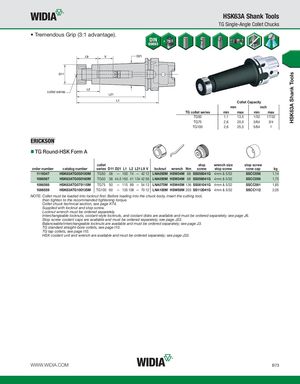 HSK63A Shank Tools HSK63A Shank Tools TG Single-Angle Collet Chucks • Tremendous Grip (3:1 advantage). collet series Collet Capacity mm inch TG collet series min max min max TG50 1,1 13,5 1/32 17/32 TG75 2,6 20,0 3/64 3/4 TG100 2,6 25,5 5/64 1 TG Round-HSK Form A collet stop wrench size stop screw order number catalog number series D11 D21 L1 L2 L21 L9 V locknut wrench Nm screw stop screw cone cap kg 1119347 HSK63ATG050100M TG50 38 — 100 74 — 42 12 LNA050M HSW34M 68 SS056041G 4mm & 5/32 SSCC056 1,14 1086567 HSK63ATG050160M TG50 38 44,5 160 41 134 42 58 LNA050M HSW34M 68 SS056041G 4mm & 5/32 SSCC056 1,75 1086568 HSK63ATG075115M TG75 50 — 115 89 — 54 13 LNA075M HSW45M 136 SS081041G 4mm & 5/32 SSCC081 1,65 1086559 HSK63ATG100135M TG100 60 — 135 109 — 70 12 LNA100M HSW58M 203 SS112041G 4mm & 5/32 SSCC112 2,05 NOTE: Collet must be loaded into locknut first. Before loading into the chuck body, insert the cutting tool, then tighten to the recommended tightening torque. Collet chuck technical section, see page K74. Supplied with locknut and stop screw. Locknut wrench must be ordered separately. Interchangeable locknuts, coolant-style locknuts, and coolant disks are available and must be ordered separately; see page J6. Stop screw coolant caps are available and must be ordered separately; see page J22. Balanceable/interchangeable locknuts are available and must be ordered separately; see page J3. TG standard straight-bore collets, see page I10. TG tap collets, see page I10. HSK coolant unit and wrench are available and must be ordered separately; see page J32. WWW.WIDIA.COM B73