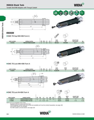 HSK63A Shank Tools HSK63A Shank Tools Tunable Shell Mill Adapters with Through Coolant SMC TD Cap MM-HSK Form A lock drive wrench size order number catalog number D1 D2 L1 L2 screw key lock screw kg 4136192 HSK63ATDSMC22220M 22 49 220 194 MS1234 KDK22M 8mm 3,34 SMC TD Lock MM-HSK Form A lock drive wrench size order number catalog number D1 D2 L1 L2 screw key lock screw kg 4135978 HSK63ATDSMC27260M 27 61 260 234 KLSS27M — 10mm 5,59 SMC TD Lock IN-HSK Form A lock drive wrench size order number catalog number D1 D2 L1 L2 L20 L21 screw key lock screw lbs 4135979 HSK63ATDSMC0750866 3/4 1.75 8.66 .53 6.96 7.64 KLS07 KDK05 1/4 7.28 4135980 HSK63ATDSMC1001050 1 2.19 10.50 9.48 — — KLS10 KDK06 5/16 11.06 NOTE: Do not overtighten lock screw. Supplied with lock screw and drive keys. Interchangeable coolant-style lock screws are available and must be ordered separately; see page J26. Lock screw wrench not included. For HSK coolant unit and wrench, see page J32. B80 WWW.WIDIA.COM