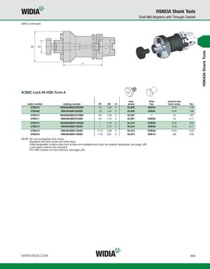 HSK63A Shank Tools HSK63A Shank Tools Shell Mill Adapters with Through Coolant (SMC continued) SMC Lock IN-HSK Form A lock drive wrench size order number catalog number D1 D2 L1 screw key lock screw lbs 3762410 HSK63ASM2C050200 1/2 1.20 2 KLS05 KDK04 3/16 1.76 3762409 HSK63ASMC050200 1/2 1.44 2 KLS05 KDK04 3/16 1.89 3762412 HSK63ASM2C075200 3/4 1.46 2 KLS07 — 1/4 1.97 3762411 HSK63ASMC075200 3/4 1.75 2 KLS07 KDK05 1/4 2.17 3762414 HSK63ASM2C100225 1 2.19 2 KLS10 KDK06 5/16 2.83 3762413 HSK63ASMC100225 1 2.75 2 KLS10 KDK06 5/16 3.11 3762415 HSK63ASMC125225 1 1/4 2.88 2 KLS12 KDK08 5/16 3.40 3762416 HSK63ASMC150225 1 1/2 3.81 2 KLS15 KDK10 3/8 4.59 NOTE: Do not overtighten lock screw. Supplied with lock screw and drive keys. Interchangeable coolant-style lock screws are available and must be ordered separately, see page J26. Lock screw wrench not included. For HSK coolant unit and wrench, see page J32. WWW.WIDIA.COM B83