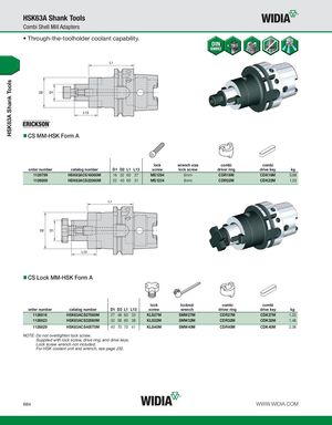 HSK63A Shank Tools HSK63A Shank Tools Combi Shell Mill Adapters • Through-the-toolholder coolant capability. CS MM-HSK Form A lock wrench size combi combi order number catalog number D1 D2 L1 L13 screw lock screw driver ring drive key kg 1126799 HSK63ACS16060M 16 32 60 27 MS1294 6mm CDR16M CDK16M 0,88 1126808 HSK63ACS22060M 22 40 60 31 MS1234 8mm CDR22M CDK22M 1,03 CS Lock MM-HSK Form A lock locknut combi combi order number catalog number D1 D2 L1 L13 screw wrench driver ring drive key kg 1126816 HSK63ACS27060M 27 48 60 33 KLS27M SMW27M CDR27M CDK27M 1,23 1126823 HSK63ACS32060M 32 58 60 38 KLS32M SMW32M CDR32M CDK32M 1,48 1126829 HSK63ACS40070M 40 70 70 41 KLS40M SMW40M CDR40M CDK40M 2,08 NOTE: Do not overtighten lock screw. Supplied with lock screw, drive ring, and drive keys. Lock screw wrench not included. For HSK coolant unit and wrench, see page J32. B84 WWW.WIDIA.COM