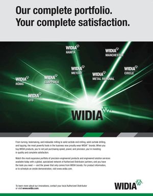 Our complete portfolio. Your complete satisfaction. From turning, holemaking, and indexable milling to solid carbide end milling, solid carbide drilling, and tapping, the most powerful tools in the business now proudly wear WIDIA™ brands. When you buy WIDIA products, you’re not just purchasing speed, power, and precision, you’re investing in quality and complete satisfaction. Match the most expansive portfolio of precision-engineered products and engineered solution services available today with a global, specialized network of Authorized Distributor partners, and you have the tools you need — and the power that only comes from WIDIA brands. For product information, or to schedule an onsite demonstration, visit www.widia.com. To learn more about our innovations, contact your local Authorized Distributor or visit www.widia.com.