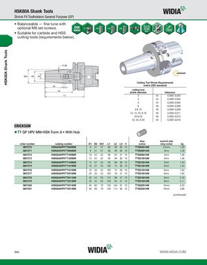 HSK80A Shank Tools HSK80A Shank Tools Shrink Fit Toolholders General Purpose (GP) • Balanceable — fine tune with optional M6 set screws. • Suitable for carbide and HSS cutting tools (requirements below). Cutting Tool Shank Requirements metric (ISO standard) cutting tool shank diameter tolerance 3 h4 0,000/-0,003 4 h4 0,000/-0,004 5 h5 0,000/-0,005 6 h6 0,000/-0,008 8 & 10 h6 0,000/-0,009 12, 14, 16, & 18 h6 0,000/-0,011 20 & 25 h6 0,000/-0,013 32, 40, & 50 h6 0,000/-0,016 TT GP HPV MM-HSK Form A • With Hub stop wrench size order number catalog number D1 D2 D21 L1 L2 L9 V screw stop screw kg 3867270 HSK80AHPVTT06085M 6 21 27 85 59 26 10 TTSS05014M 2,5mm 1,28 3867271 HSK80AHPVTT08085M 8 21 27 85 59 26 10 TTSS06014M 3mm 1,28 3867272 HSK80AHPVTT10090M 10 24 32 90 64 31 10 TTSS08014M 4mm 1,36 3867273 HSK80AHPVTT12095M 12 24 32 95 69 36 10 TTSS10014M 5mm 1,38 3867274 HSK80AHPVTT14095M 14 27 34 95 69 36 10 TTSS10014M 5mm 1,43 3867275 HSK80AHPVTT16100M 16 27 34 100 74 39 10 TTSS12014M 6mm 1,44 3867276 HSK80AHPVTT18100M 18 33 42 100 74 39 10 TTSS12014M 6mm 1,63 3867277 HSK80AHPVTT20105M 20 33 42 105 79 41 10 TTSS16014M 8mm 1,65 3867278 HSK80AHPVTT25115M 25 44 53 115 89 47 10 TTSS16014M 8mm 2,19 3867279 HSK80AHPVTT32120M 32 44 53 120 94 51 10 TTSS16014M 8mm 2,11 3867280 HSK80AHPVTT40130M 40 60 70 130 104 51 10 TTSS20014M 10mm 3,23 3867281 HSK80AHPVTT50140M 50 69 79 140 114 56 10 TTSS20014M 10mm 3,88 (continued) B94 WWW.WIDIA.COM